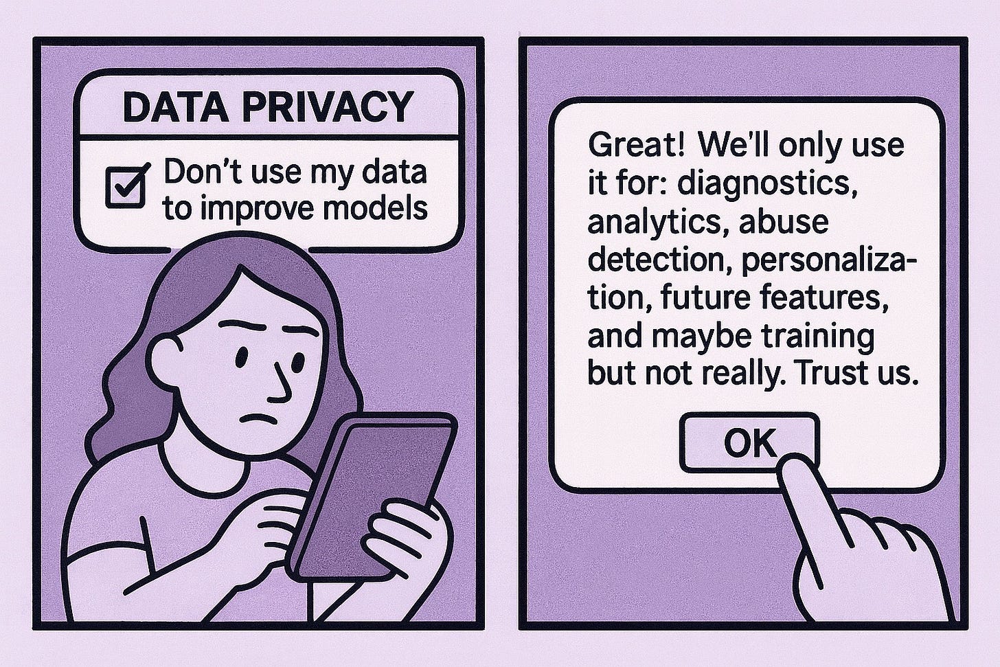 Users rarely give explicit consent for social media posts and online activity (think reddit posts) being used to train models. Even when consent technically exists, it’s buried in settings most people never see, under ‘opt-out’ rather than ‘opt-in’. For example, LinkedIn recently announced it will start training AI models on user data, unless users opt out.